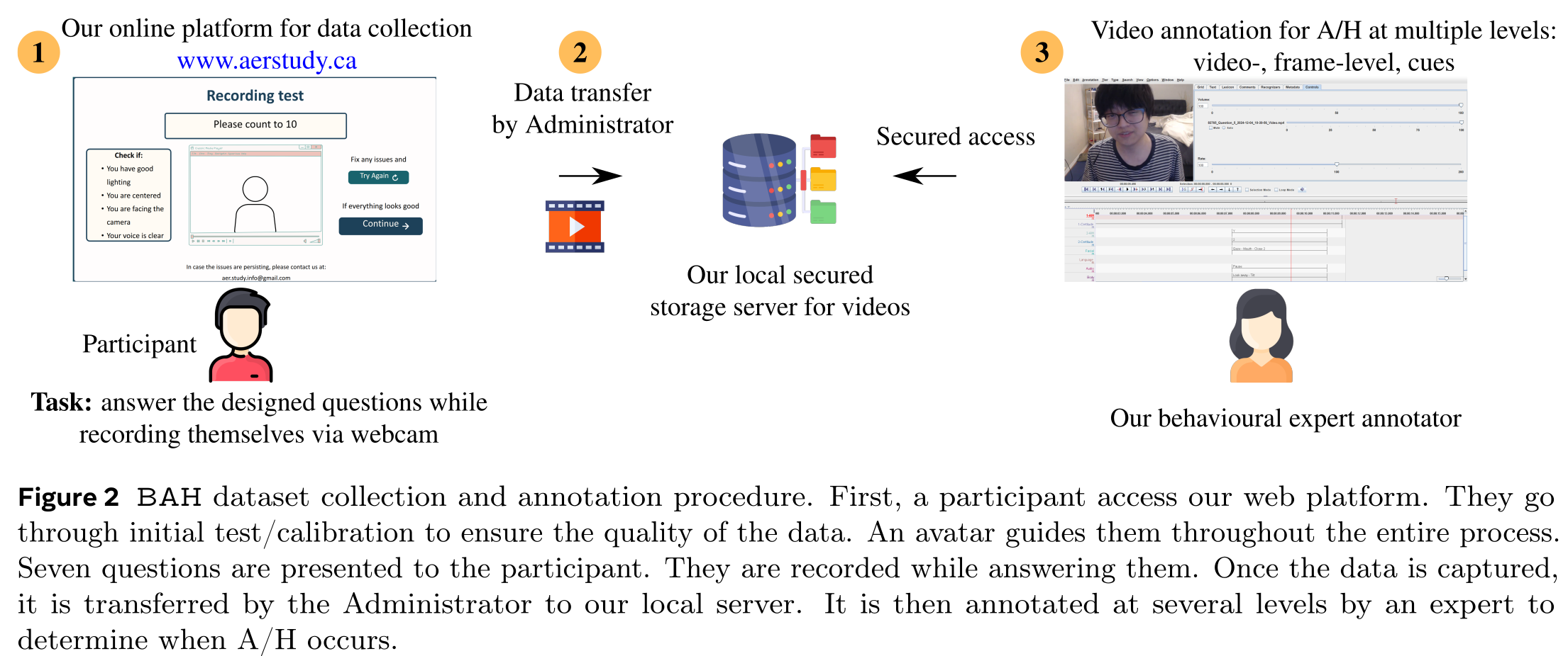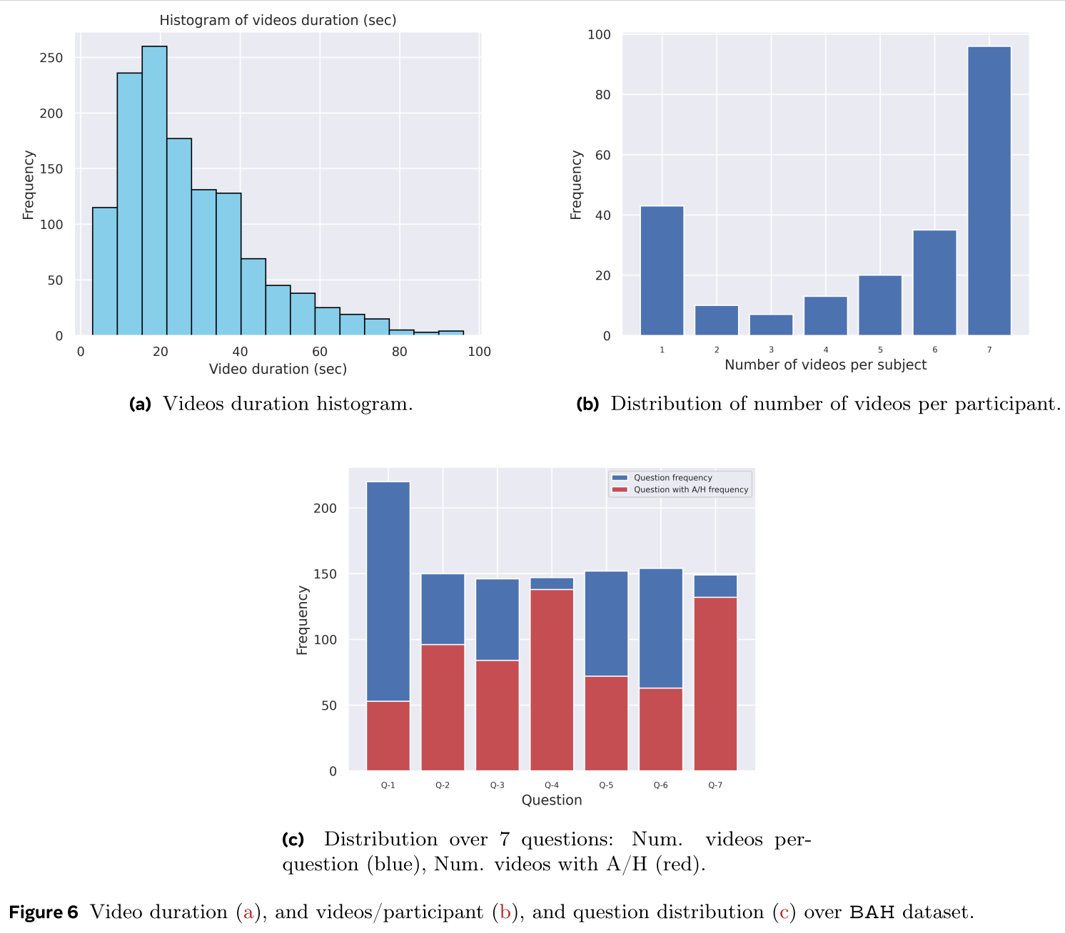 All participants agreed to be part of this dataset. However, 50 participants (22.3%) did not consent to be in publications while only seven participants (3.1%) did not consent to be part of challenges. The recorded videos contain both English and French languages. Each participant can record up to seven videos where 96 participants have recorded the full seven videos. We obtained an average of ${\sim5}$ videos/participant where each participant has an average of ${\sim2.84}$ videos with A/H which is equivalent to ${\sim585}$ frames of A/H (or $\sim24.15$ seconds of A/H). The dataset amounts a total of 1,118 videos (${\sim 8.26}$ hours) where 638 videos contain A/H (${\sim 1.50}$ hours). This amounts to 714,005 total frames where 131,103 contain A/H. Since captured videos represent answers to questions, they are relatively short. BAH dataset has an average video duration of ${26.58 \pm 16.36}$ (seconds) with a minimum and maximum duration of 3 and 96 seconds.