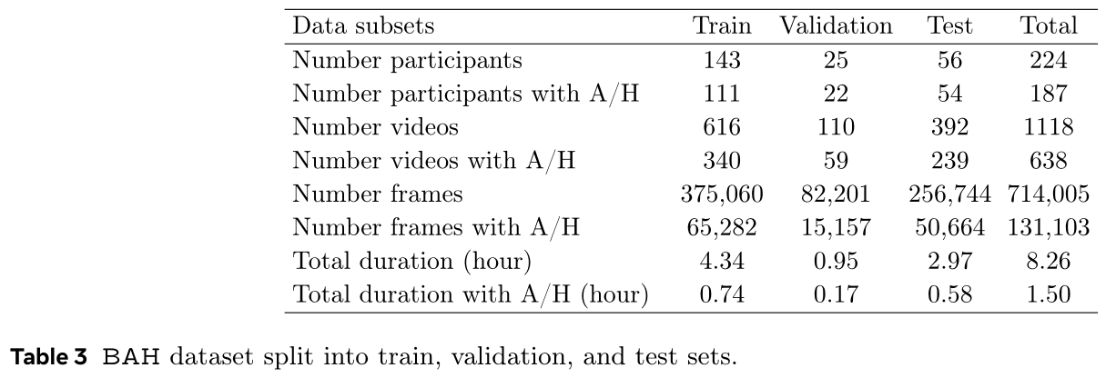Dataset split. The dataset is divided randomly based on participants into 3 sets: train, validation and test set. The train and validation sets amounts to 3/4 of the total participants, while 1/4 goes to the test set. Videos of one participants belong to one and one set only. The details of each set is presented in the following tables. The split files are provided along with the dataset files. They contain the split in terms of videos and frames ready to use. Note that the dataset is highly imbalanced, especially at frame level where only 18.15% contains A/H. This factor should be accounted for during training and evaluation. The dataset can be used for training at video- and/or frame-level. The participant identifiers are provided in the splits allowing subject-based learning scenarios.