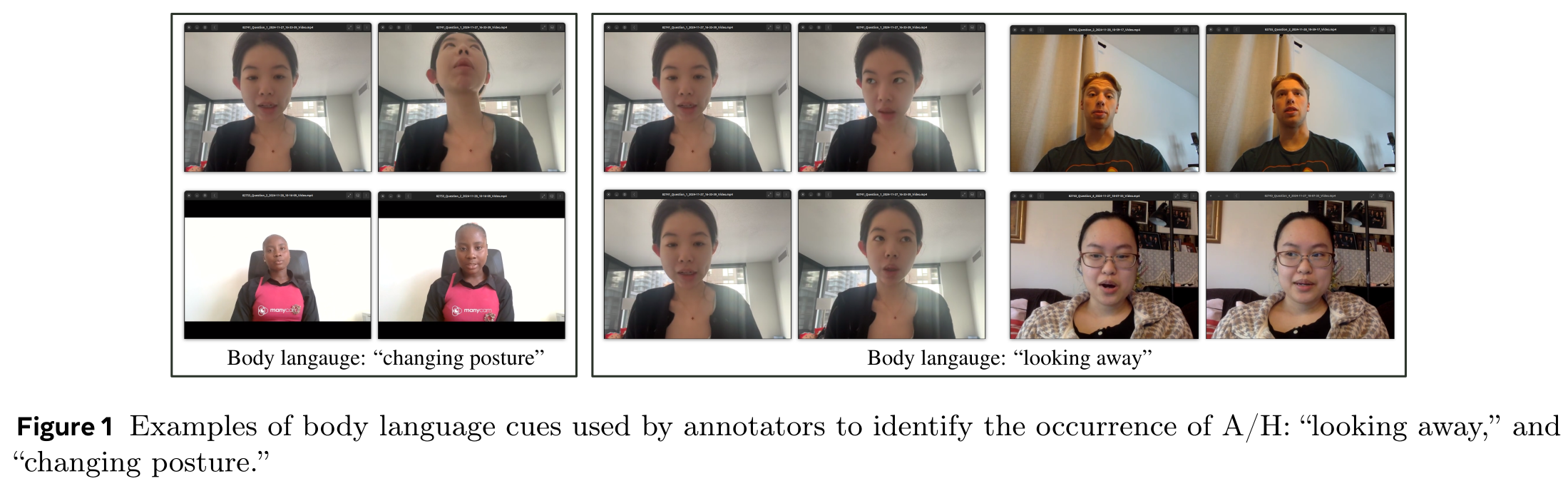 Our initial benchmarking yielded limited performance highlighting the difficulty of A/H recognition. Our results showed also that leveraging context, multimodality, and adapted feature fusion is a first good direction to design robust models. Our dataset and code are made public.