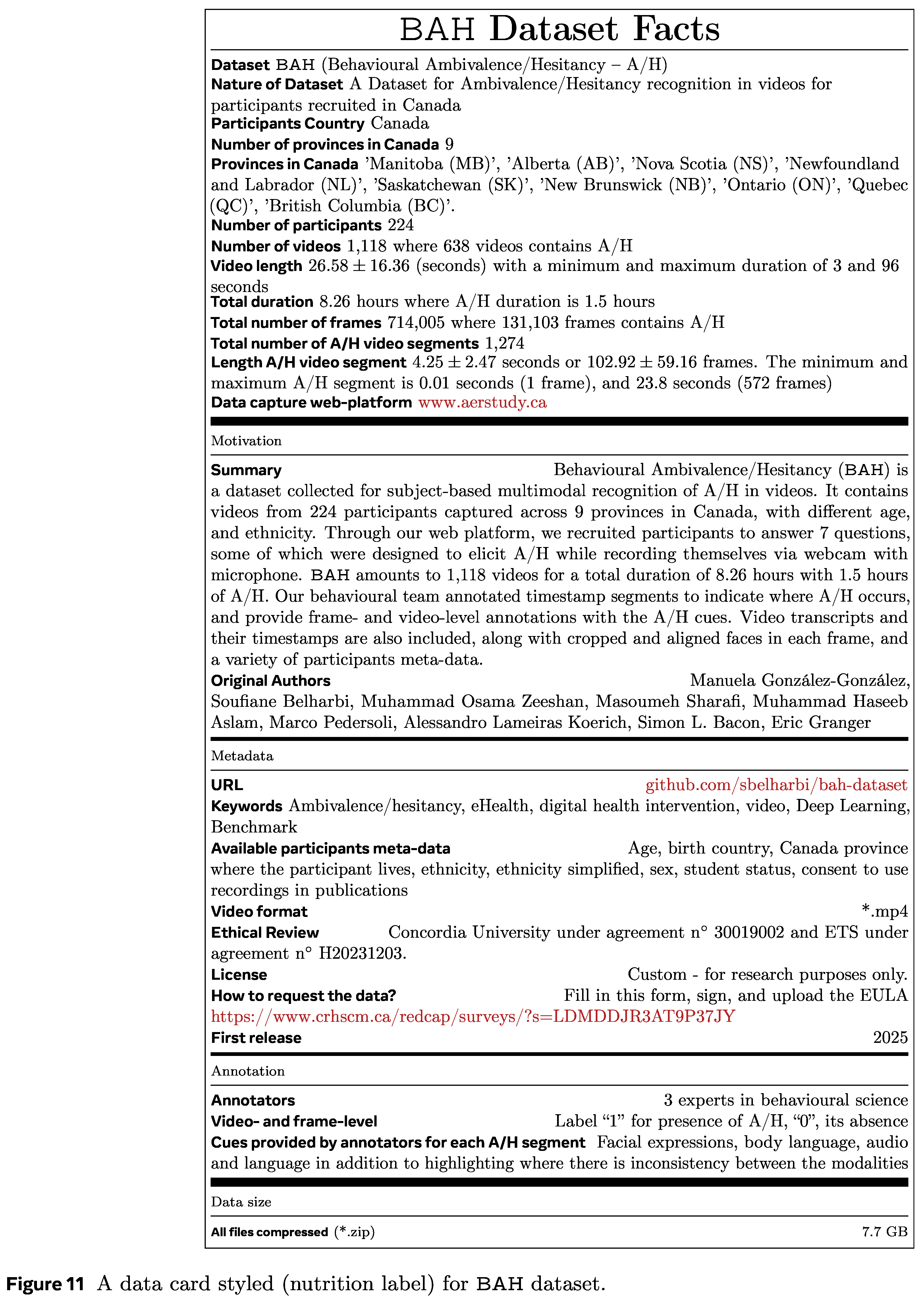 The public BAH dataset contains the row videos, detailed A/H annotation at video- and frame-level, cues, and per participant demographic information including age, birth country, Canada province where the participant lives, ethnicity, ethnicity simplified, sex, student status, consent to use recordings in publications.