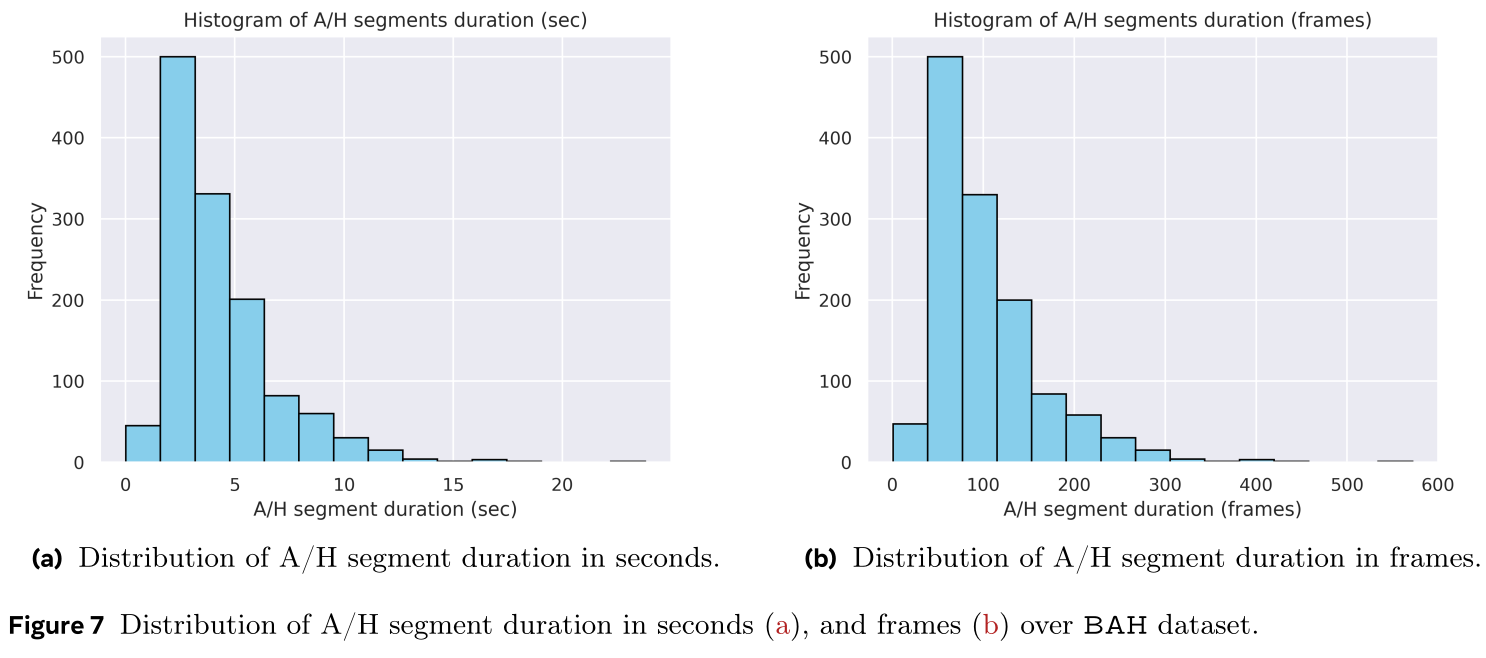 An important characteristic of this dataset is the duration of the A/H segments in videos. BAH counts a total of 376 videos with multiple A/H segments and 259 videos with only one A/H segment. In total, there are 1,274 A/H segments. In particular, the duration of segment varies but it is brief with an average of ${4.25 \pm 2.47}$ seconds which is equivalent to ${102.92 \pm 59.16}$ frames. The minimum and maximum A/H segment is 0.01 seconds (1 frame), and 23.8 seconds (572 frames), respectively.