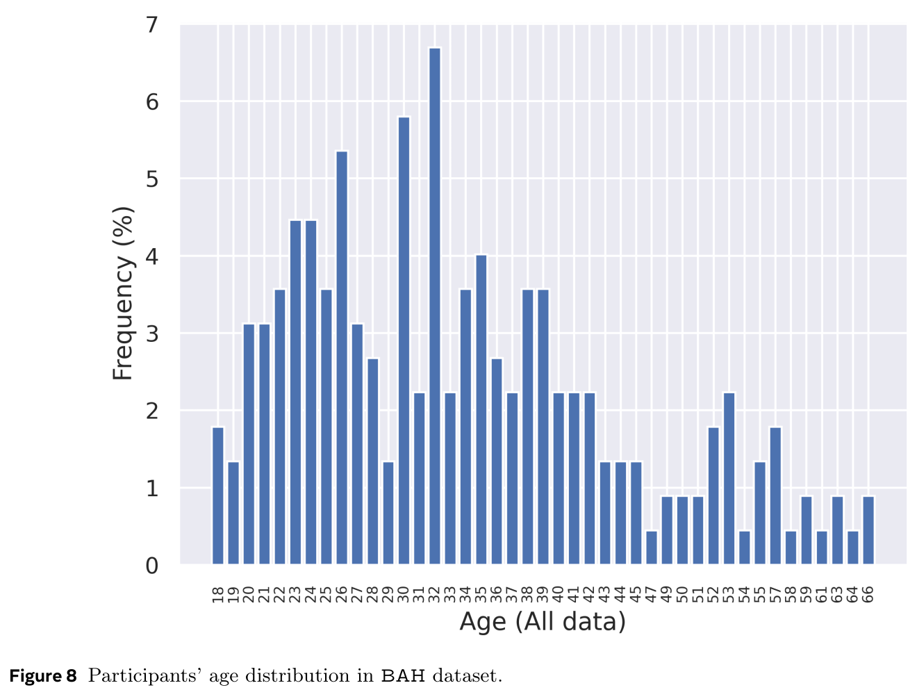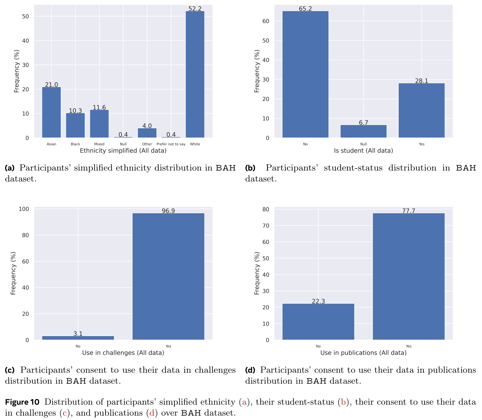 In terms of participants age, the dataset covers a large range from 18 to 66 years old. In particular, 37.1% of the participants covers the range 25-34 years, followed by the range of 35-44 years with 25.9%, then the range of 18-24 with 21.9%. In terms of sex, 59.8% are male, while 39.3 are female. As for ethnicity variation, White comes with 52.2% of the participants, followed by Asian with 21.0%, and Mixed with 11.6%, then Black with 10.3%. Large part of the participants are not students (65.2%) which limits common issues in recruit bias.