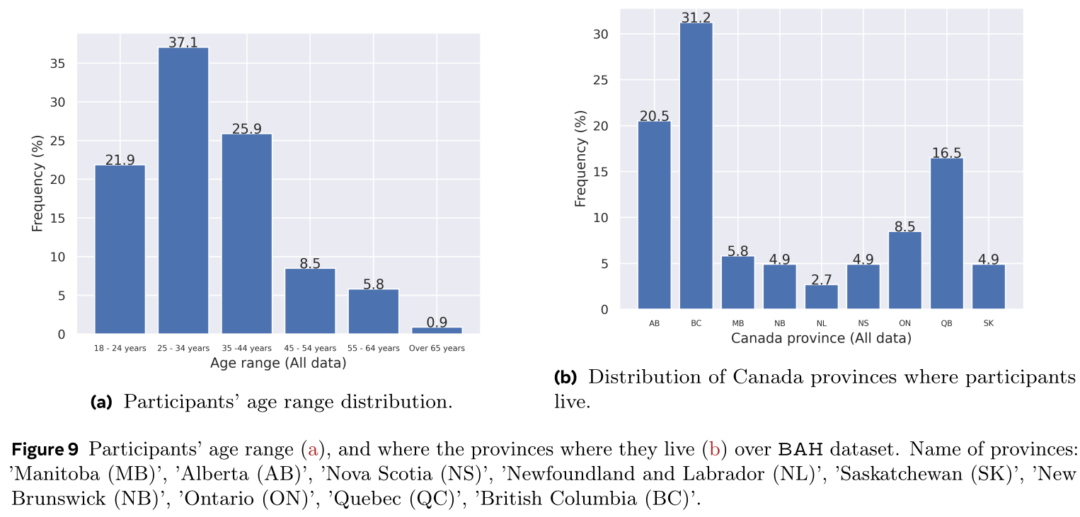 The dataset is designed to approximate the demographic distribution of sex and provincial representation in Canada. The BAH dataset is composed of 224 participant across Canada from nine provinces where 31.2% of participants is from British Columbia followed by Alberta with 20.5% and Quebec with 16.5% .